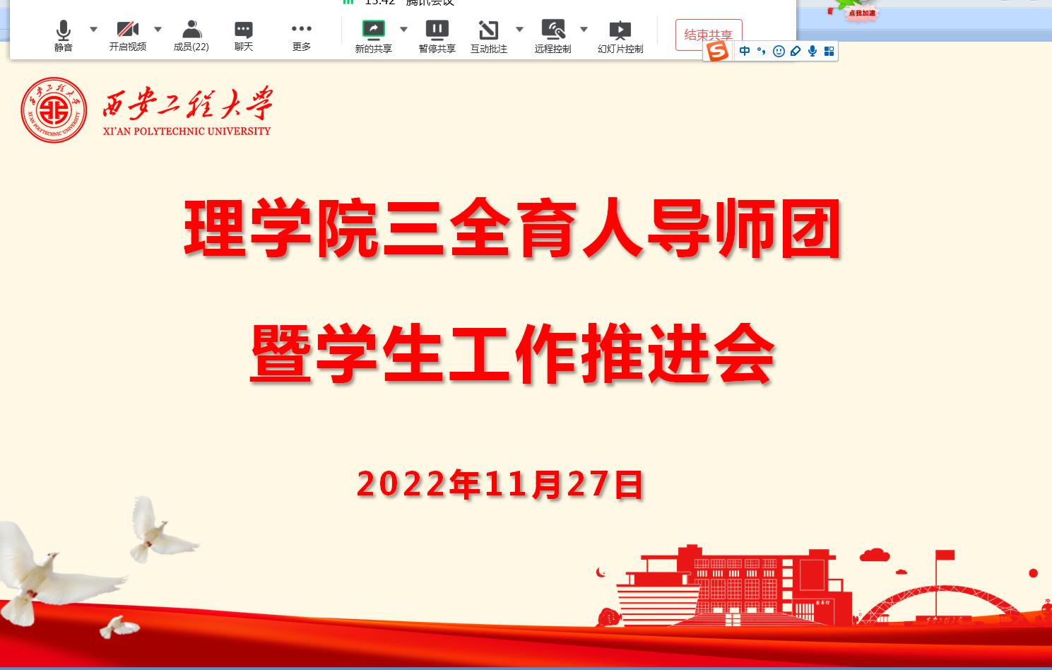11月27日,公司召开三全育人导师团暨员工工作推进会,安排部署近期公司三全育人导师团及员工工作。会议采取腾讯会议线上召开的方式进行,公司党委书记陈宣、副经理(主持工作)马盈仓、院党副书记文毅、副经理成鹏飞、副经理冯进钤及gs公司三全育人导师团各团团长、导师团秘书参加了会议。