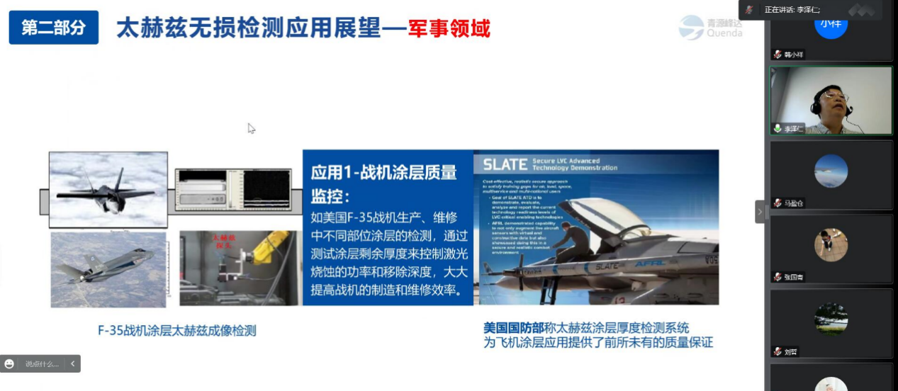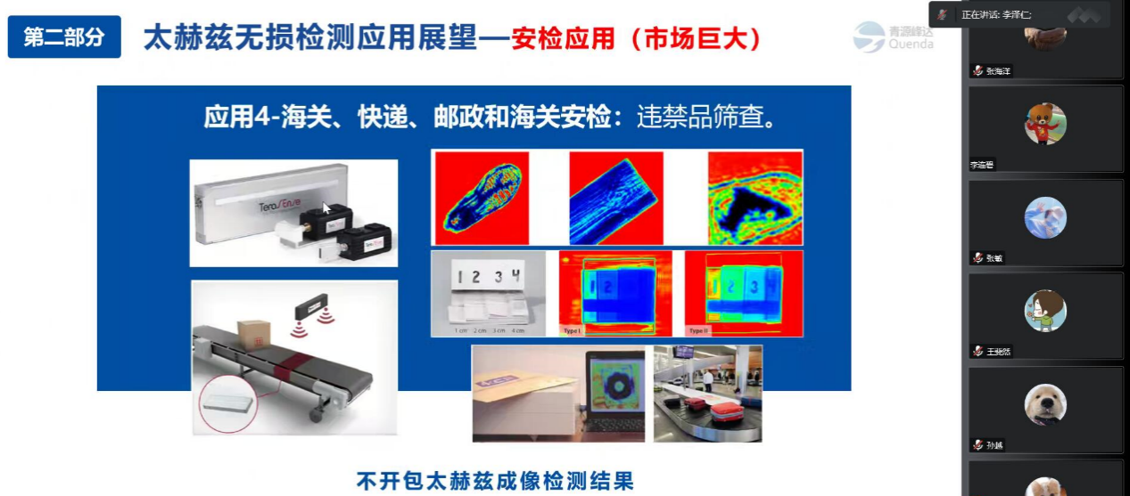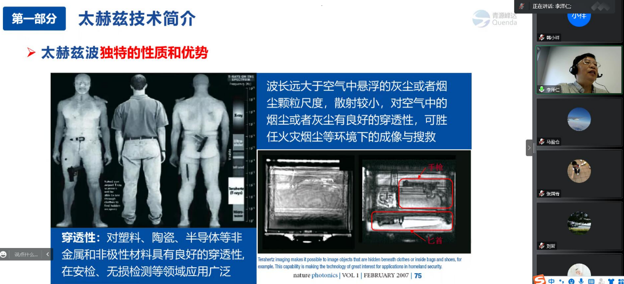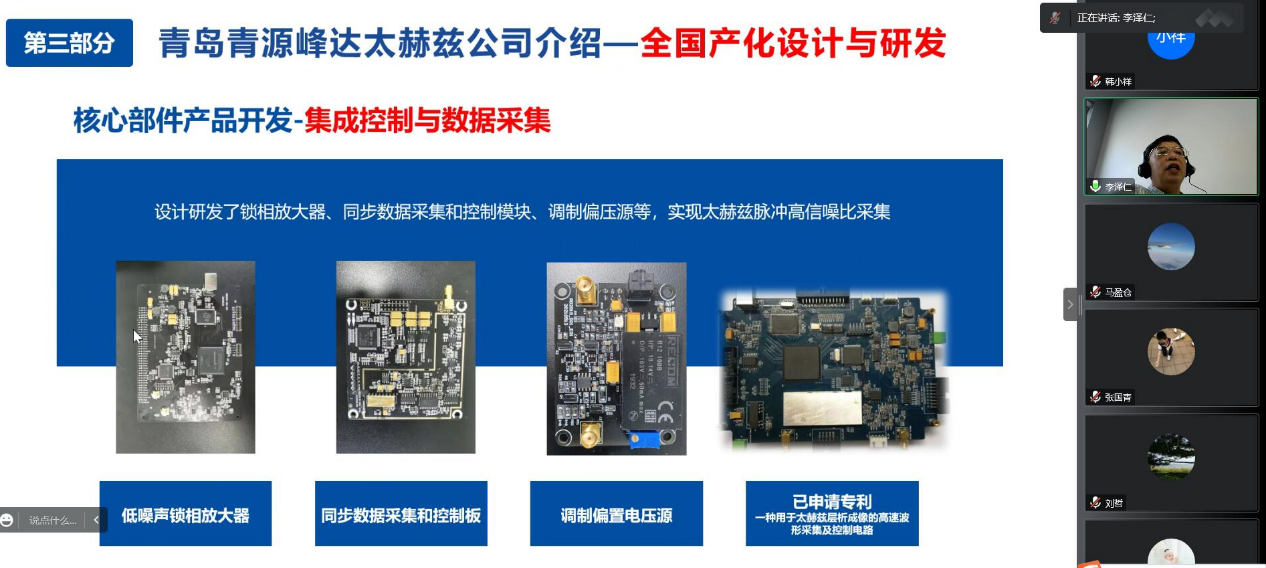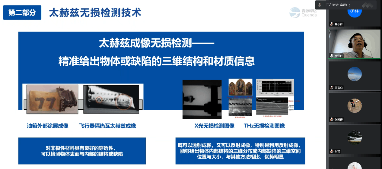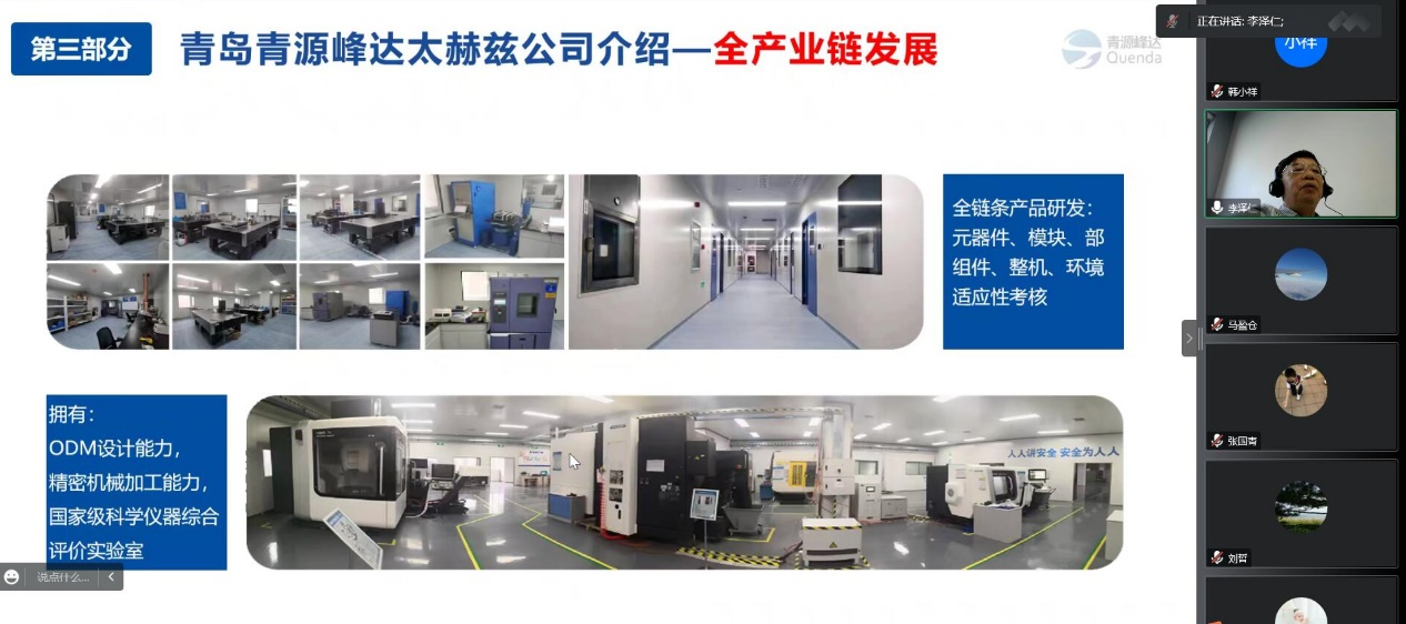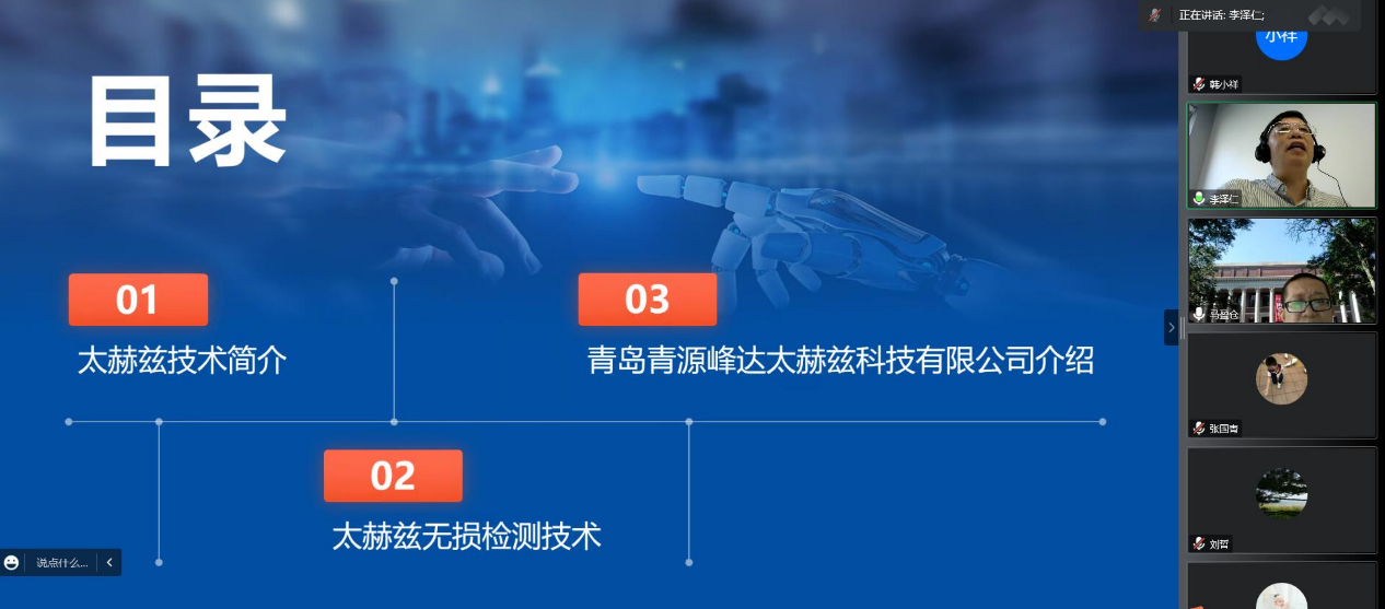 李泽仁教授报告内容涉及太赫兹波的独特性质和优势,太赫兹技术的战略意义,基于透射成像和反射成像的太赫兹无损检测技术原理,太赫兹无损检测技术在军事、航空航天、安全检查、工业制造等领域的应用和青岛青源峰达太赫兹科技有限公司的介绍。此外,围绕具体的太赫兹技术,以及加强本院与青岛青源峰达太赫兹科技有限公司的产学研合作等问题,李教授与公司师生开展了深入的讨论交流。