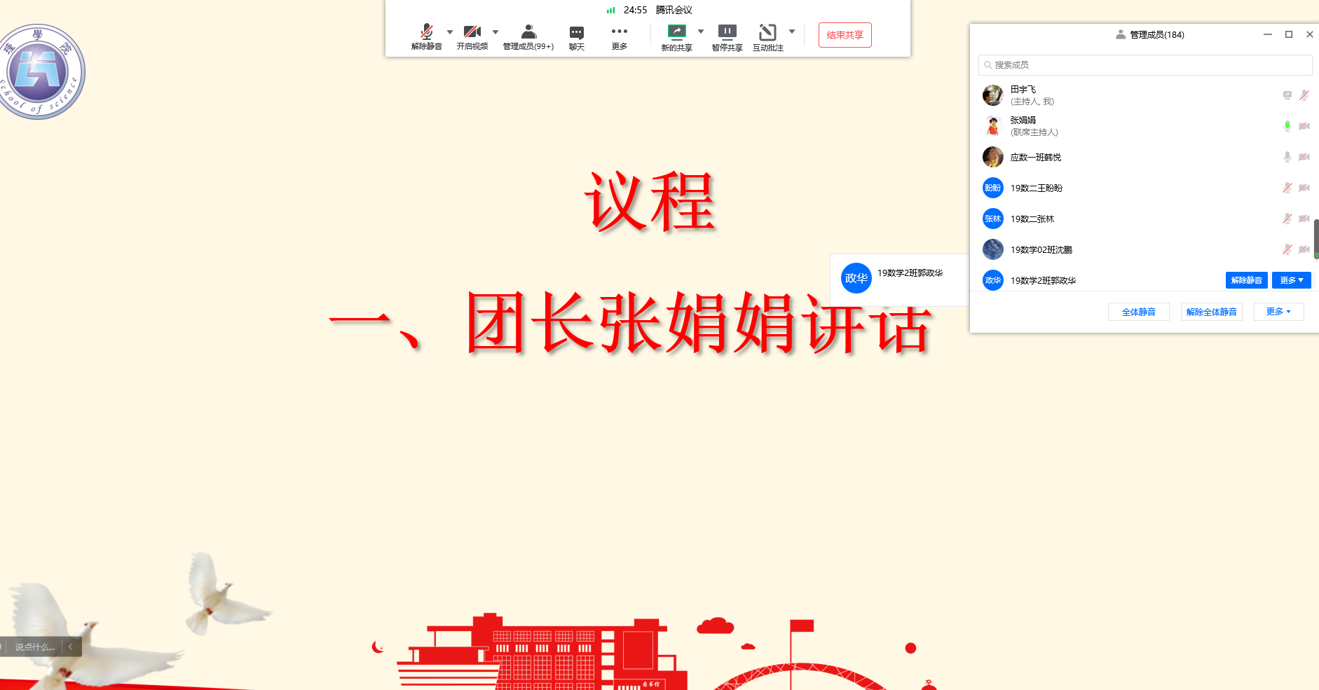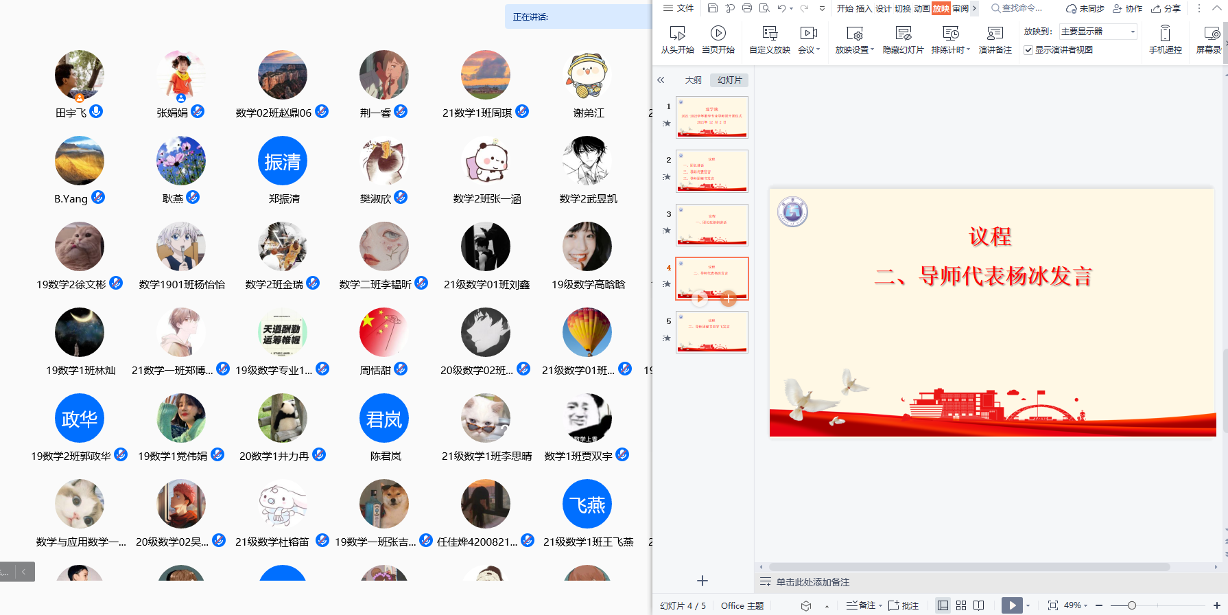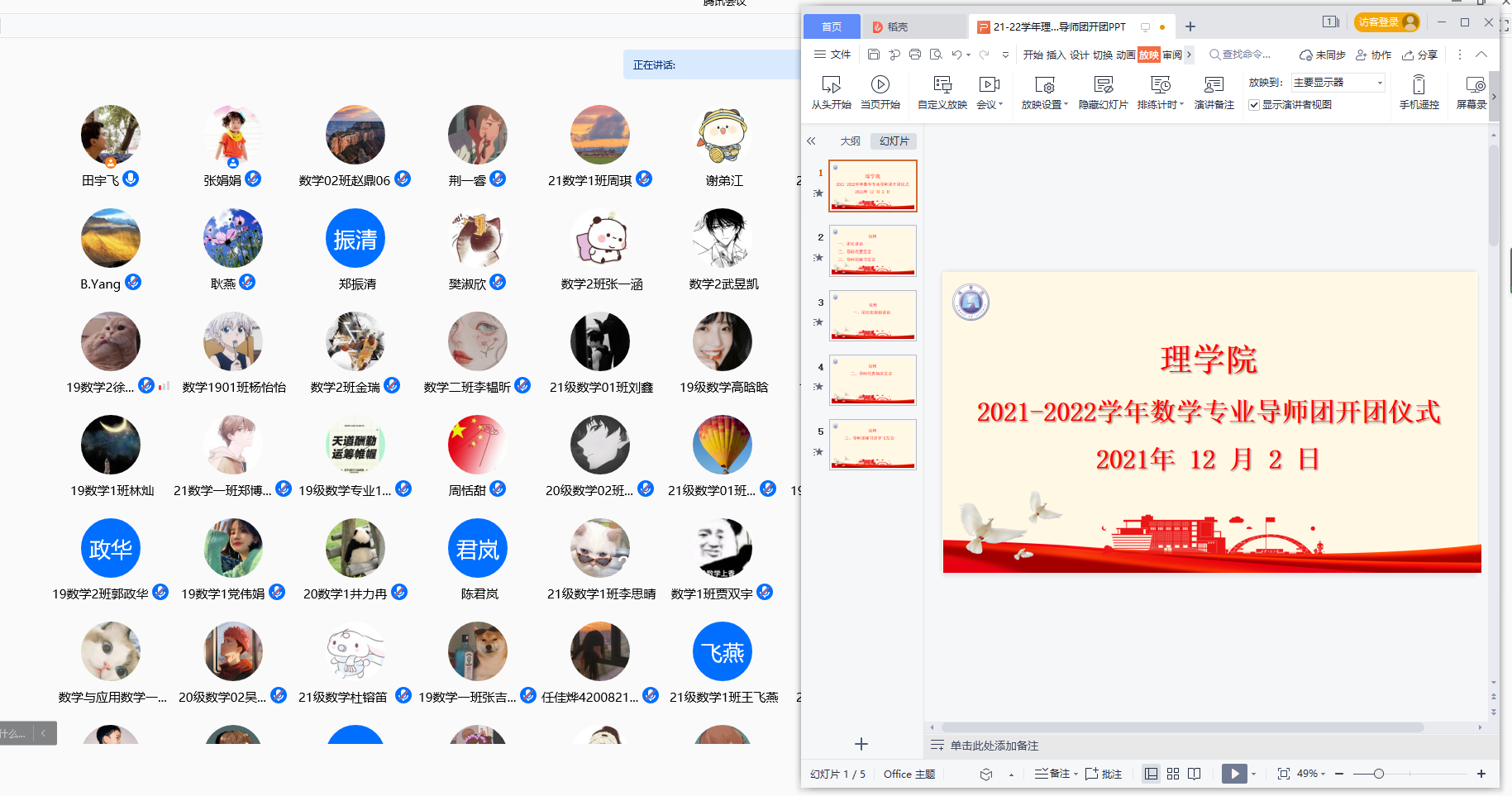2021年12月2日中午,伟德国际victor1946官网数学与应用数学专业导师团通过腾讯会议举行了在线开团仪式。导师团团长张娟娟及导师团成员、2018-2021级全体数学与应用数学专业员工参加本次仪式。仪式由导师团秘书田宇飞主持。