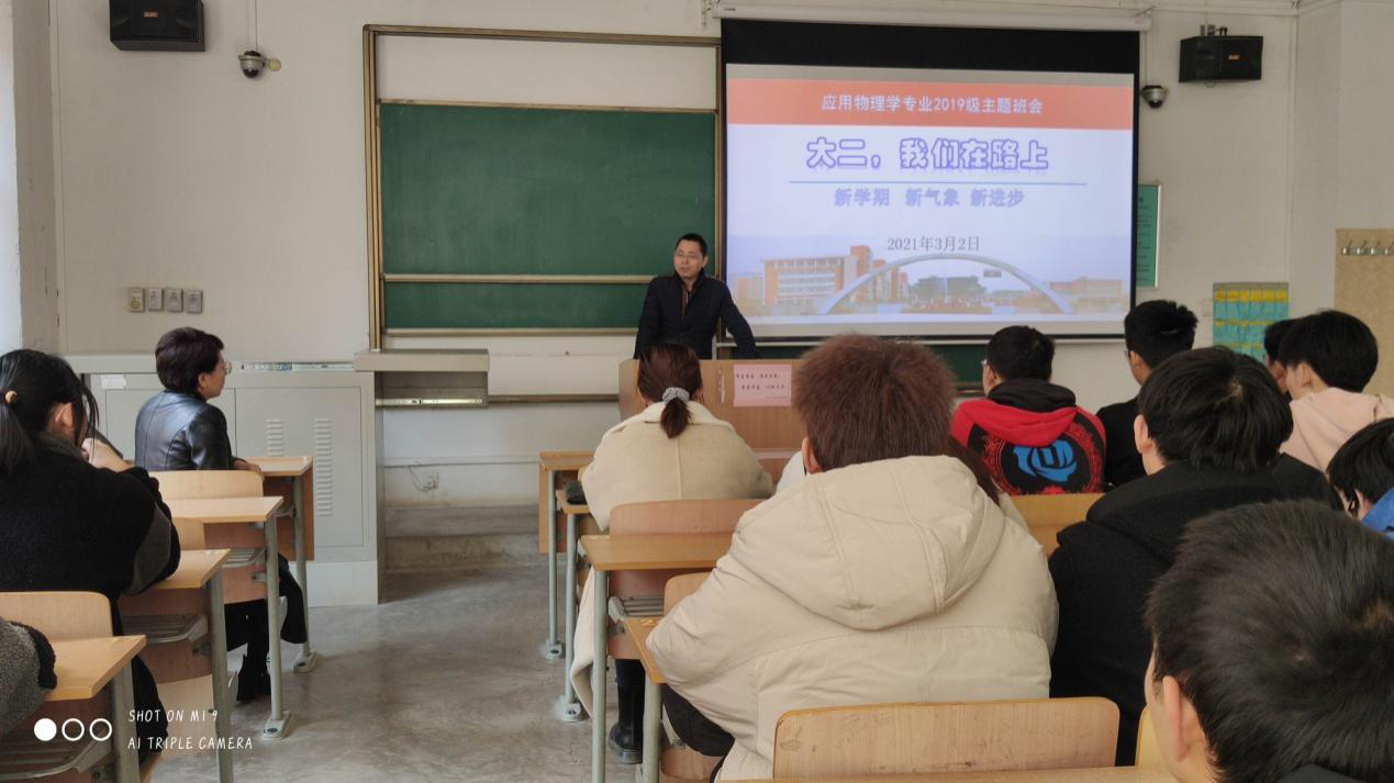 经过历史上最漫长的寒假,同学们终于返校了,应用物理学专业的各项公司产品活动也紧锣密鼓地逐一展开。2021年3月1日,2019级应用物理学专业召开了以“大二,我们在路上”为主题的新学期首次班会,班会由班主任王秋萍主持,教学副经理成鹏飞列席了班会。