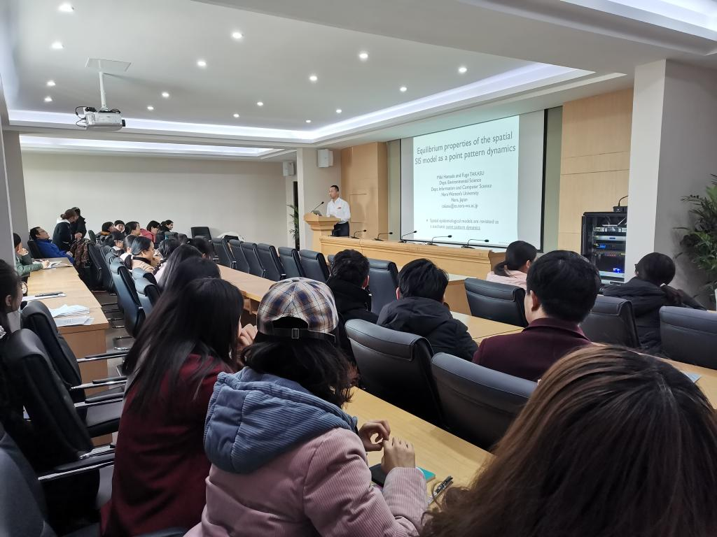 5日下午,Takasu教授在临潼校区22-8第五会议室做了题目为“ Equilibrium properties of the spatial SIS model as a point pattern dynamics-How is infection distributed over space?”的学术报告。此次报告会由伟德国际victor1946官网刘俊利教授主持,伟德国际victor1946官网多名青年教师和研究生参加了报告会。Takasu教授在报告中研究了一个经典的SIS扩散模型,研究主要集中在平衡点的空间分布。在该模型中,每一个连续空间中的点或者是易感者或者是染病者,传染方式与易感者和染病者的距离有关。随机过程以分层动力学的方式给出。模型强调了用点模式法模拟扩散种群动力学的优势。报告之后,Takasu教授与各位老师和研究生进行了交流。