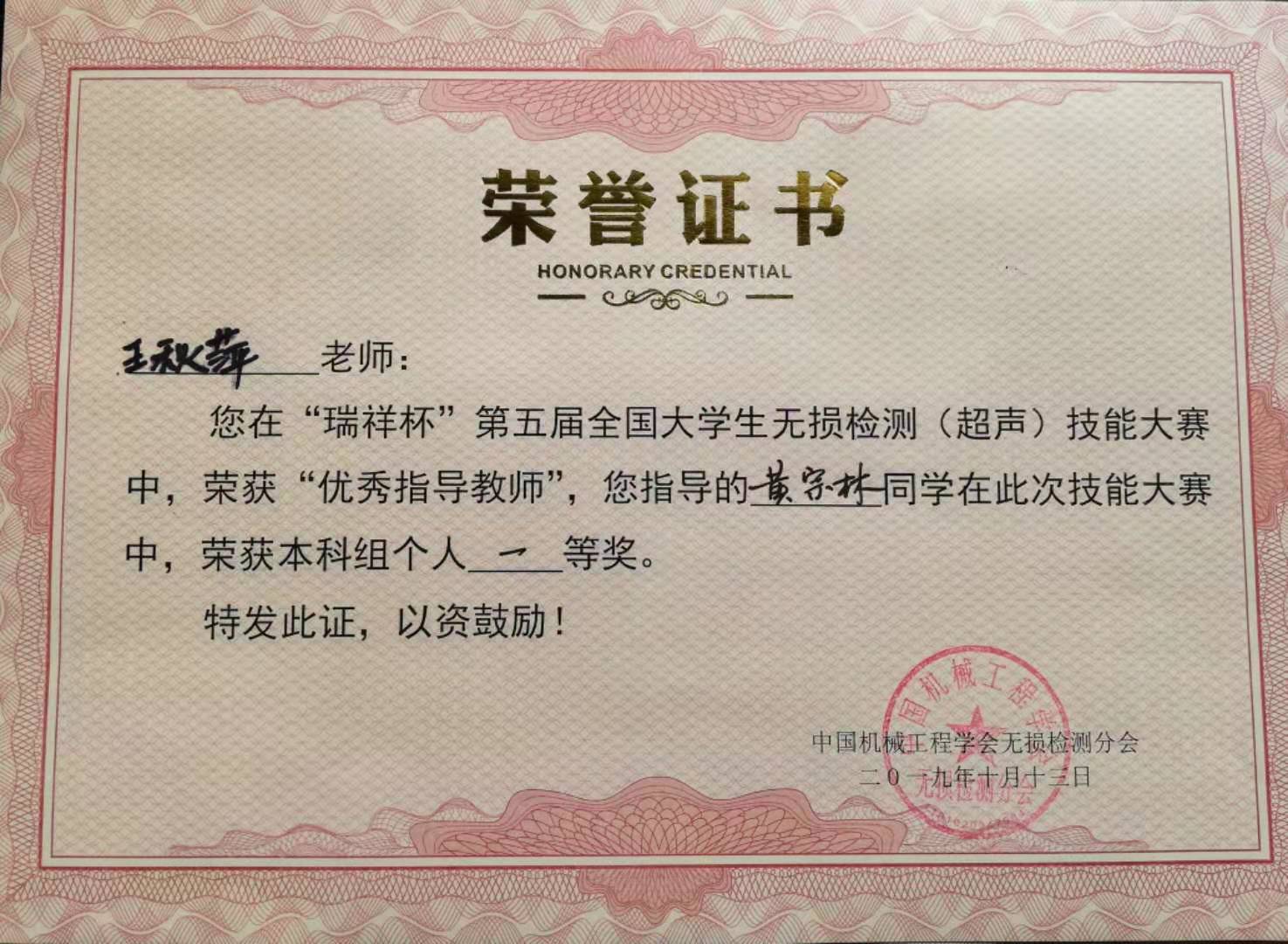 大赛中,黄宗林同学凭借扎实的专业知识和稳定的发挥荣获个人赛一等奖,王殿文和惠海峰同学获得个人赛二等奖,邓鸿林同学获得个人赛三等奖,同时他们均获得中国机械工程学会无损检测分会超声检测二级资质证书。伟德国际victor1946官网王秋萍、郝红娟两位老师分获优秀指导教师。