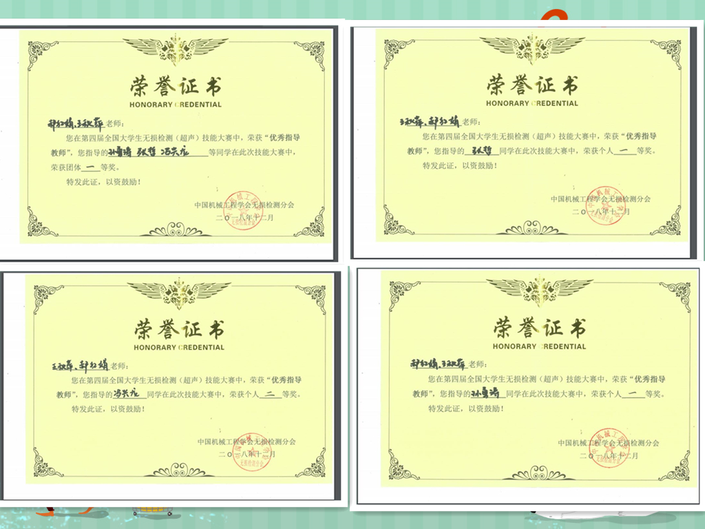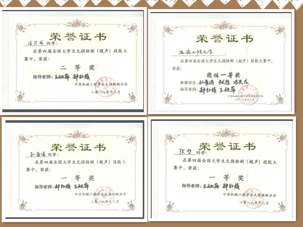赛中,孙勇涛和张哲两位同学凭借扎实的专业知识和稳定的发挥均获得个人赛一等奖,冯兴龙获得个人赛二等奖,同时他们获得中国机械工程学会无损检测分会超声检测二级人员证书。王秋萍、郝红娟两位老师获得优秀指导教师荣誉,且公司荣获团体赛一等奖。