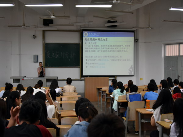 报告会上,赵文芝副教授从变点问题和研究内容出发,详细介绍了变点现象在实际中的存在形式,阐述了变点研究内容的三方面:变点检测,变点位置和变点个数估计,及变点的跃度估计。接着,深入介绍了变点统计模型、变点研究方法、两样本问题的极大似然比法等,并联系实例,分析了变点研究方法的适用范围和原理。