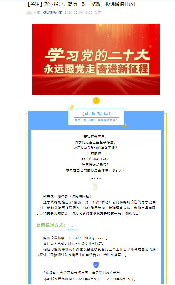 公司帮助投递的同学线下和线上同步提供一对一精细化简历指导服务,优化简历结构,针对简历的排版、结构、内容、行文等方面,做出全面的分析指导,为同学们的简历把脉问诊、对症治疗,此次活动共为50余位同学提出了简历修改意见。