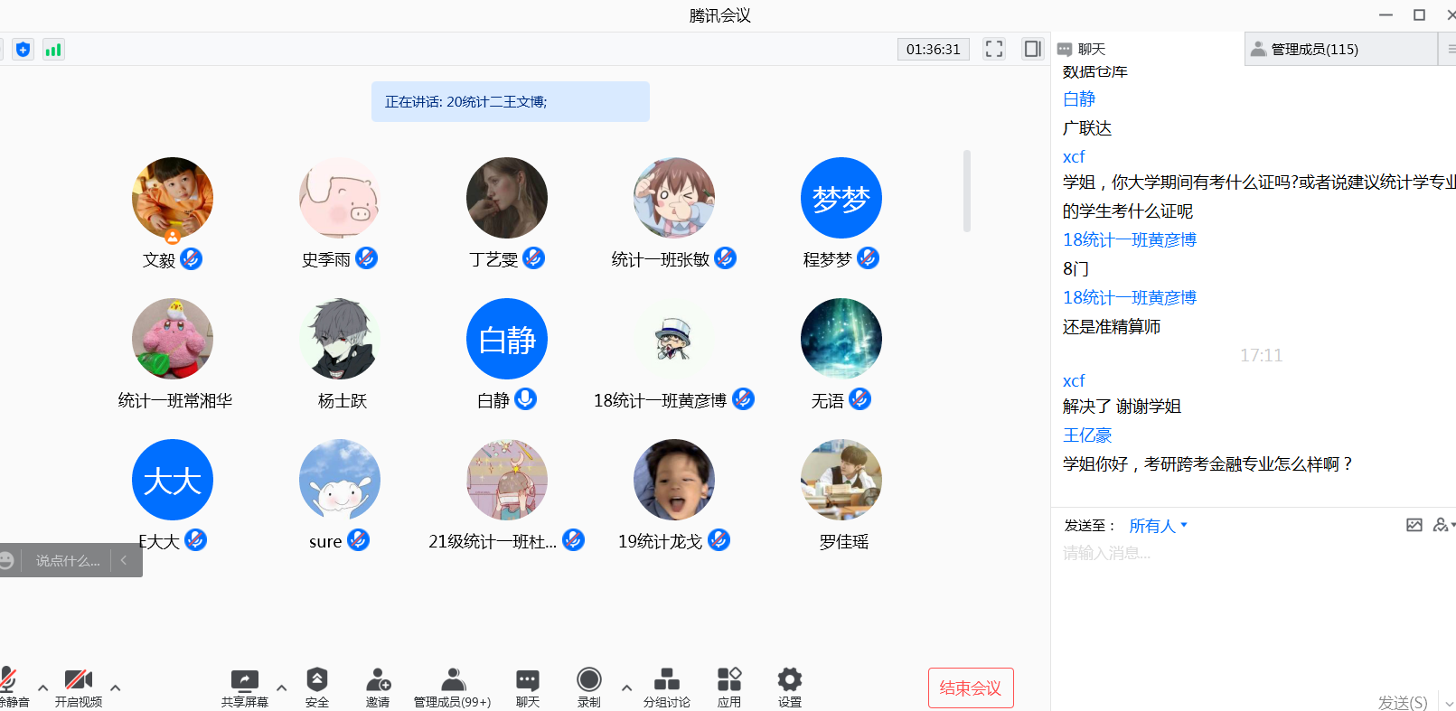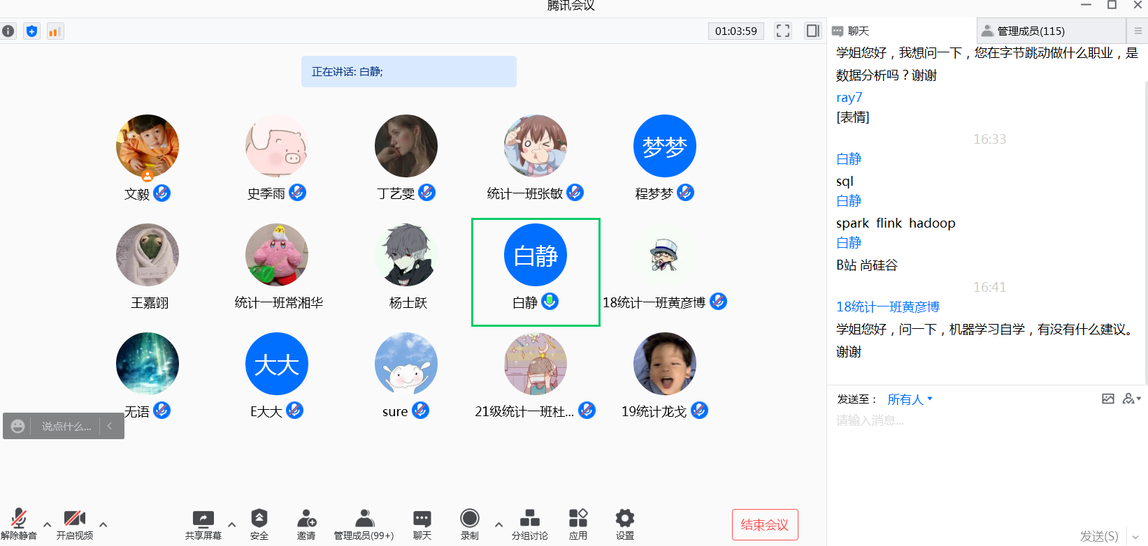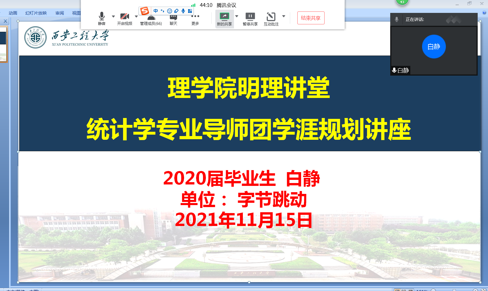 2021年11月15日下午,公司举办了“明理讲堂统计学专业导师团学涯规划讲座”,2021级、2020级、2019级全体统计学专业同学和2018级部分统计学专业同学参加。讲座由院学工办主任文毅主持。现供职于字节跳动的公司2020届毕业生白静主讲。