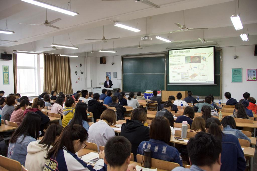 王志广教授报告主题为:《自旋电子材料与器件的机遇和挑战》。王教授简要介绍了个人的研究领域,详细介绍了自旋电子材料和器件的前沿领域及延伸领域,并对自旋电子器件研究、磁电材料与器件的应用方向、发展现状等作了分析,对智能磁电天线和5G时代、智能高频滤波器、磁存储器、柔性自旋电子学等方面也做了普及介绍。讲座后,王教授与师生们进行了交流互动。