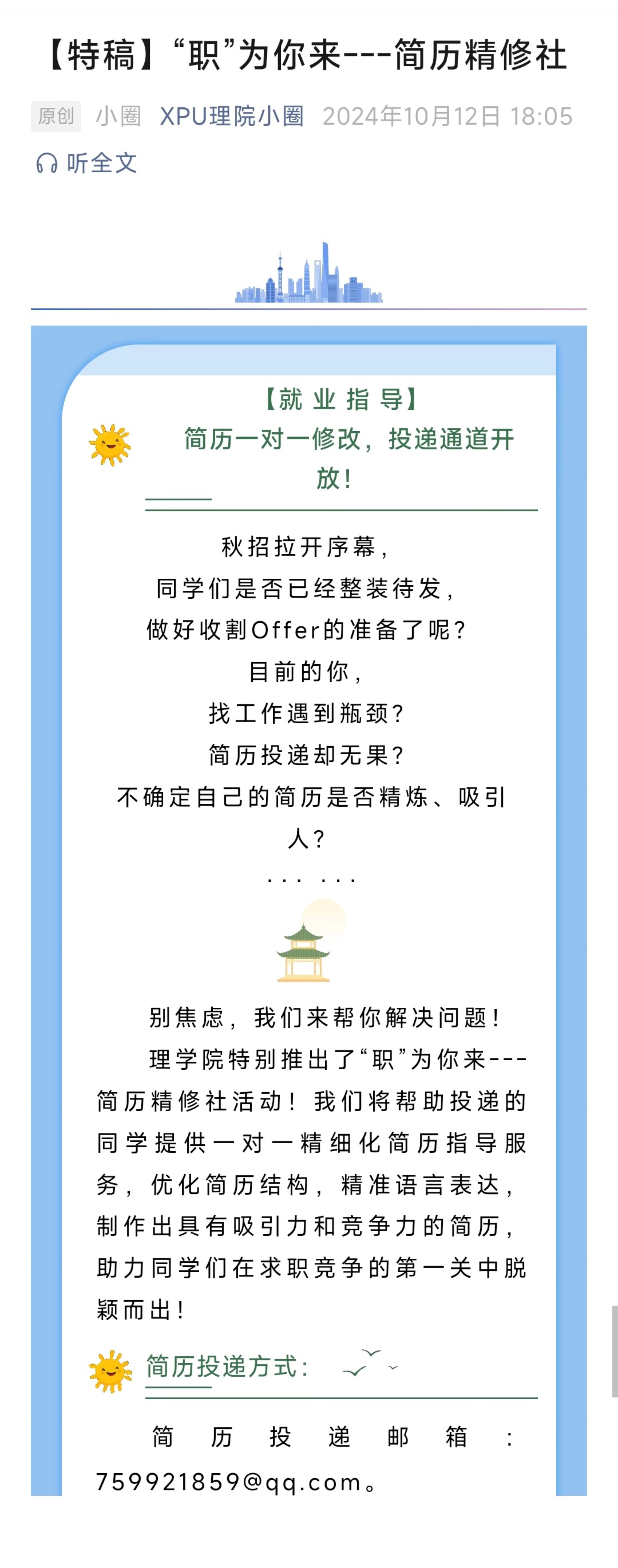 此次活动共收到简历40余份,就业辅导员边冠莉结合线上、线下的方式,帮助2025届同学们提供一对一精细化简历指导服务,优化简历结构,针对简历的排版、结构、内容、行文等方面,做出全面的分析指导,为同学们的简历把脉问诊,共计指导简历60人次。此次活动的成功举办有效地帮助同学们提升简历制作能力,进一步提高了毕业生的求职动力和信心。