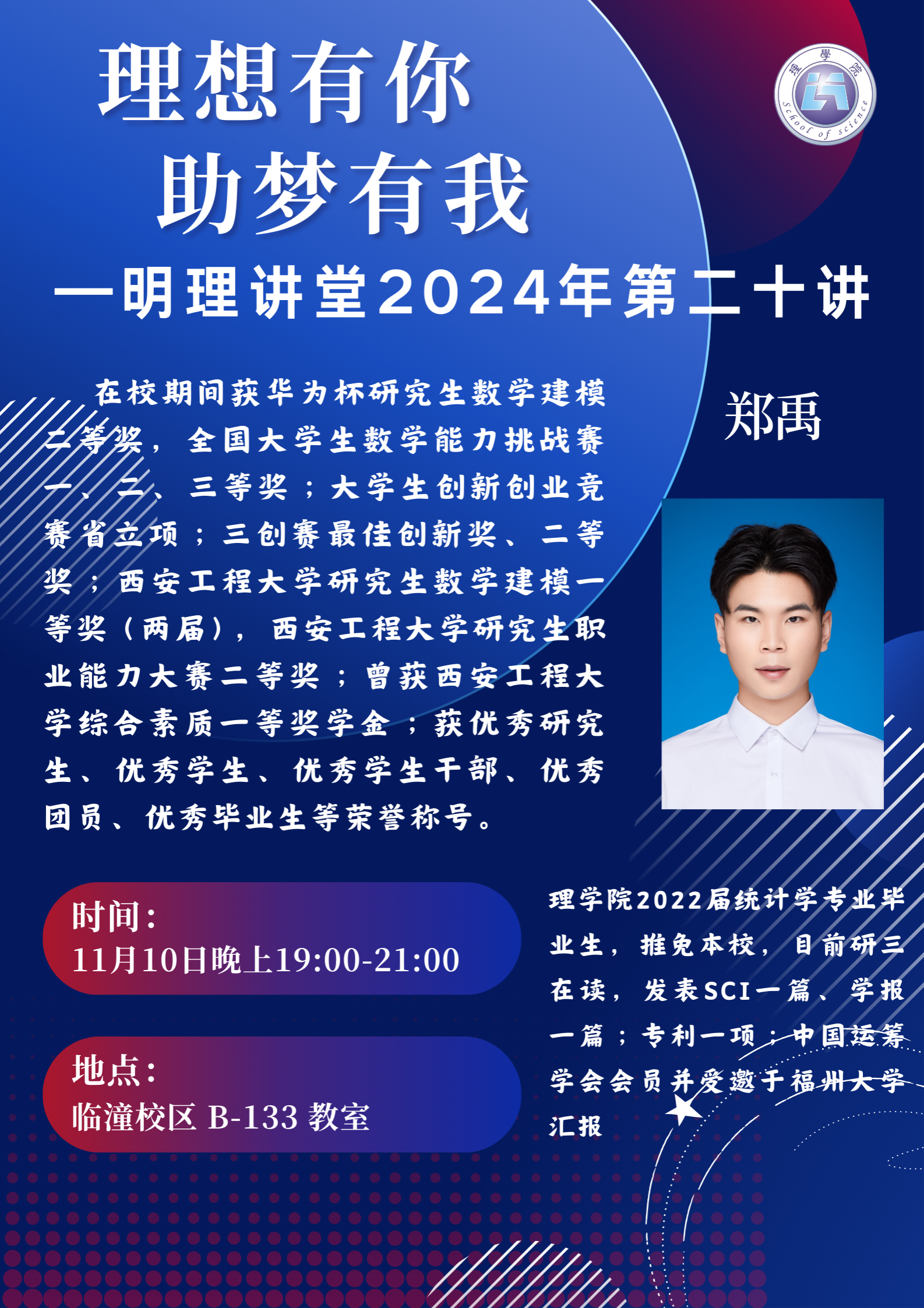 11月10日晚,伟德国际victor1946官网在临潼校区B133教室组织开展“一站式”员工社区2024年理想有你,助梦有“我”之明理讲堂第二十讲。本次讲座特邀gs公司2022届毕业生、2022级硕士研究生郑禹做了专业学习与个人学涯规划经验分享讲座,2024级全体本科生和部门2023级本科生参加了本次讲座,讲座由2024级辅导员展玉强主持。