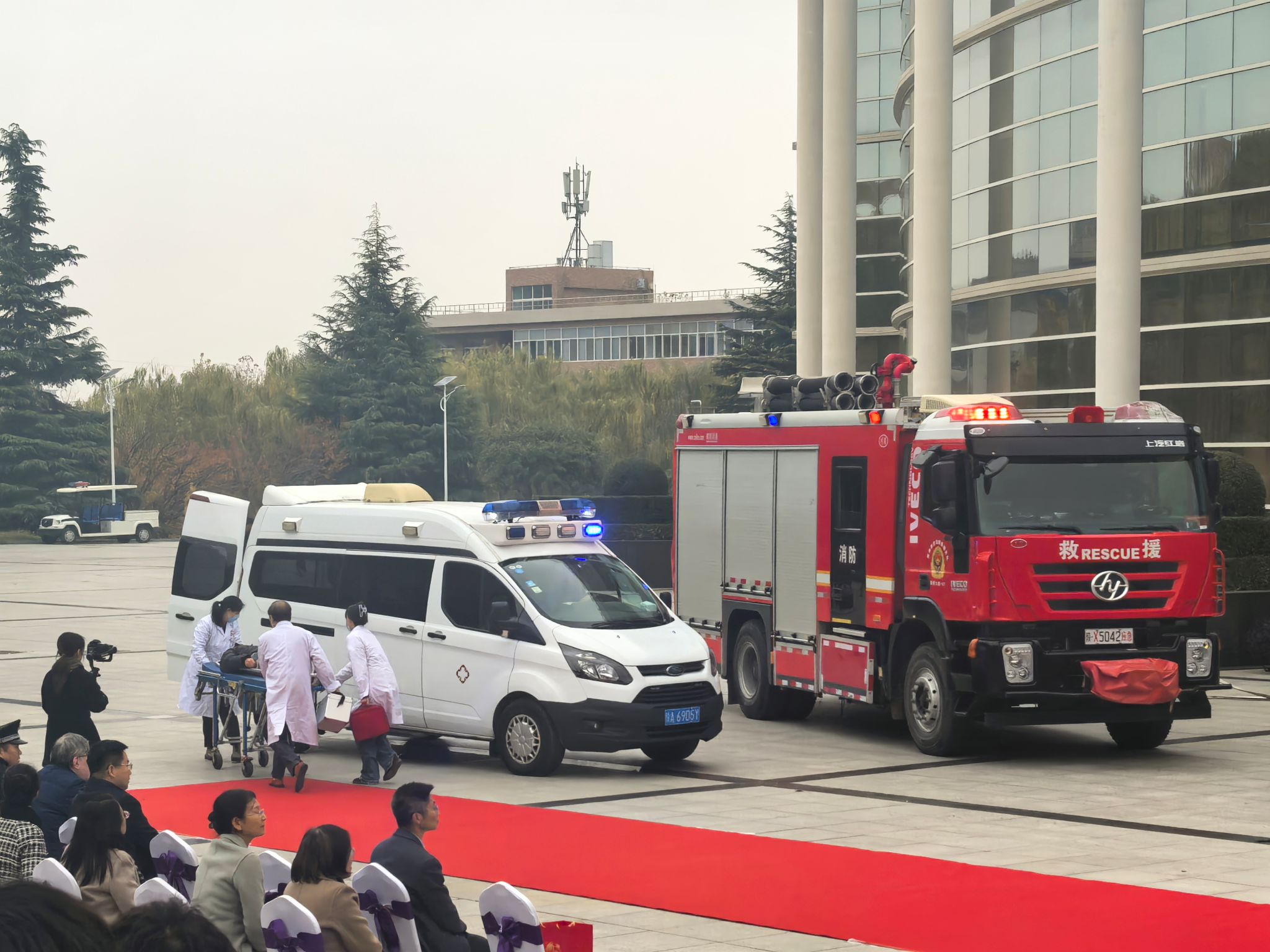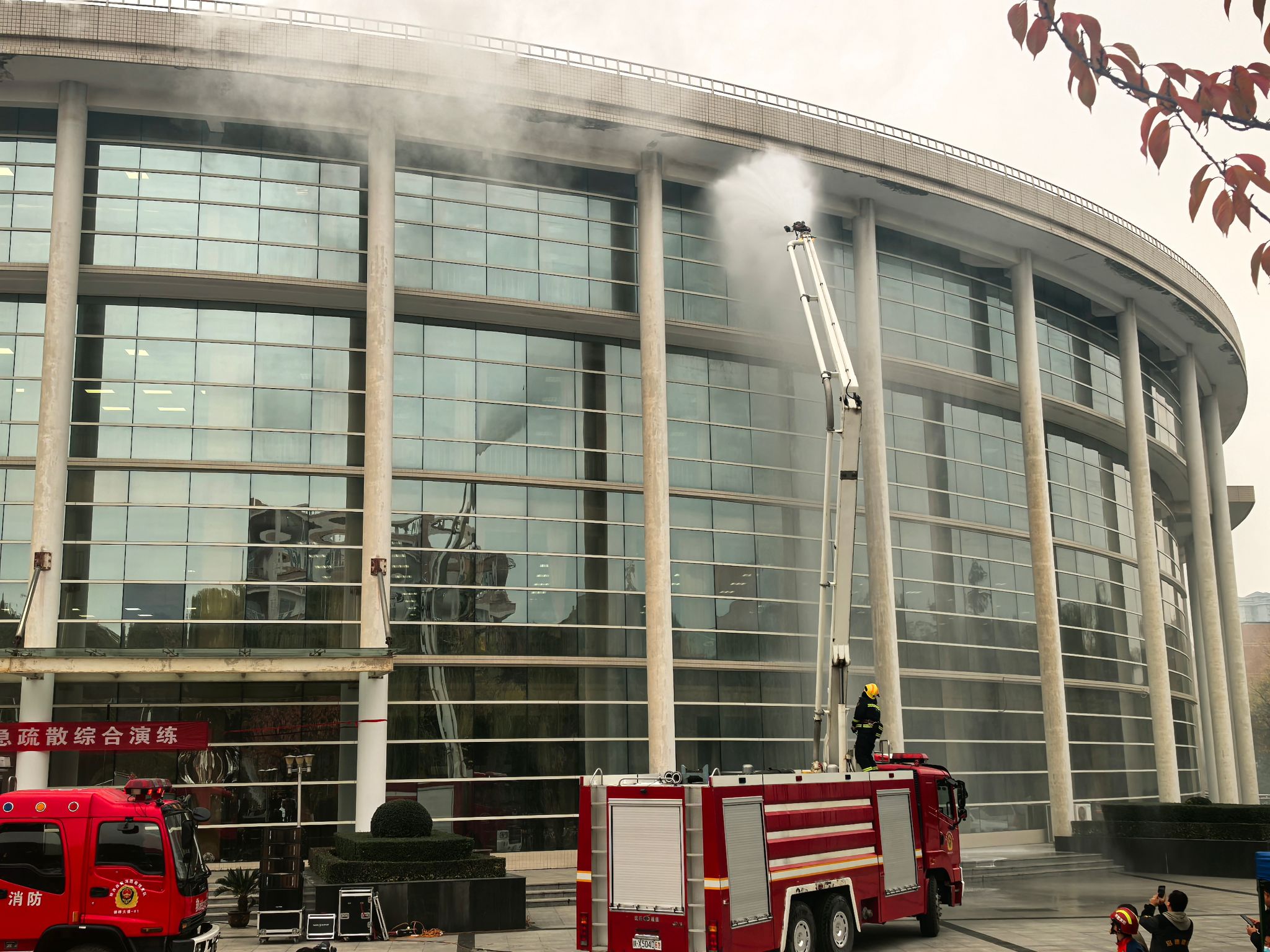 消防应急疏散环节包括消防灭火实操与应急疏散演练两部分。在灭火实操中,模拟校园内发现火点,报警人规范拨打119消防报警电话,消防队员迅速到达现场,高效扑灭火源。消防队员现场教授灭火器使用方法及逃生技巧,消防队员还展示了高压水炮等先进消防设备的工作原理及操作场景。在应急疏散演练中,随着警报响起,安保人员迅速行动,引导同学用湿布捂住口鼻,弯腰快速撤离至安全区域。同时,救援队伍迅速介入,救助被困员工,并由医疗团队实施紧急救治。消防队伍迅速控制火势,确保了所有人员的安全撤离。